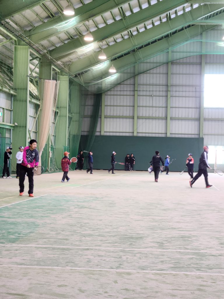 アップ、乱打の後は自由にペアを組んで試合を行いました。大学生や高校生、大人のペアに挑戦するペアもいて、楽しく試合ができました。