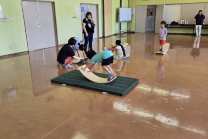 第5回キッズプレイスクールを6月28日行いました。今回は、いつもより参加人数が少ないようでしたが、新規の友達も参加し、楽しく活動できました。 新たに、平均台や跳び箱、バランスボードなど使って行いました。 ...